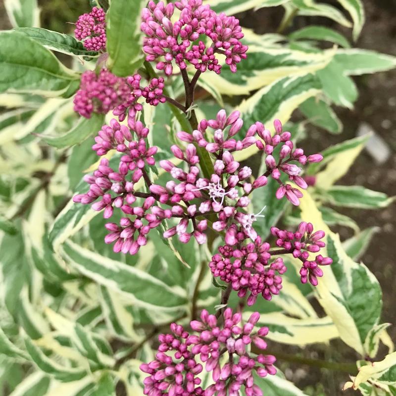 The eye-catching variegated foliage of 'Pink Frost' is deep green and creamy white. Purple-pink flower clusters will appear in August and September and are enjoyed by bees and butterflies.