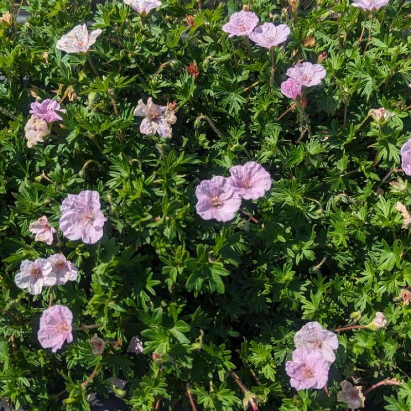 Light pink flowers with dark veining are produced in abundance all summer long on this variety that forms a compact mound of deeply divided, dark-green foliage.