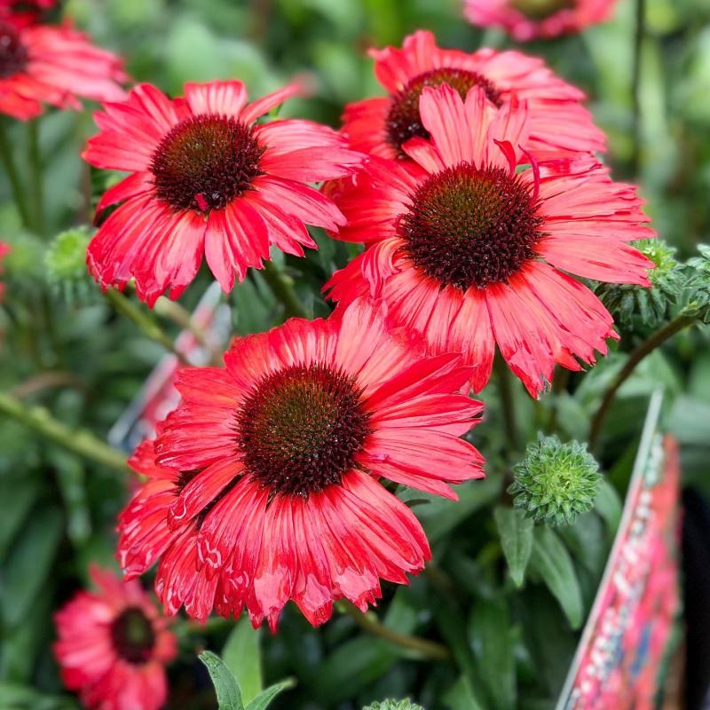 'Kismet Red' combines a dense, compact form with huge flowers that bloom nonstop. The buds begin to open in late spring and continue to show off brilliant, slightly curved, intense red rays surrounding orange cones through the summer.