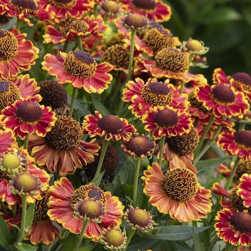 A compact sneezeweed with fiery red and orange daisy-like flowers edged in golden yellow. Blooms late summer into fall, providing vibrant seasonal color and excellent support for pollinators. Strong, upright habit.