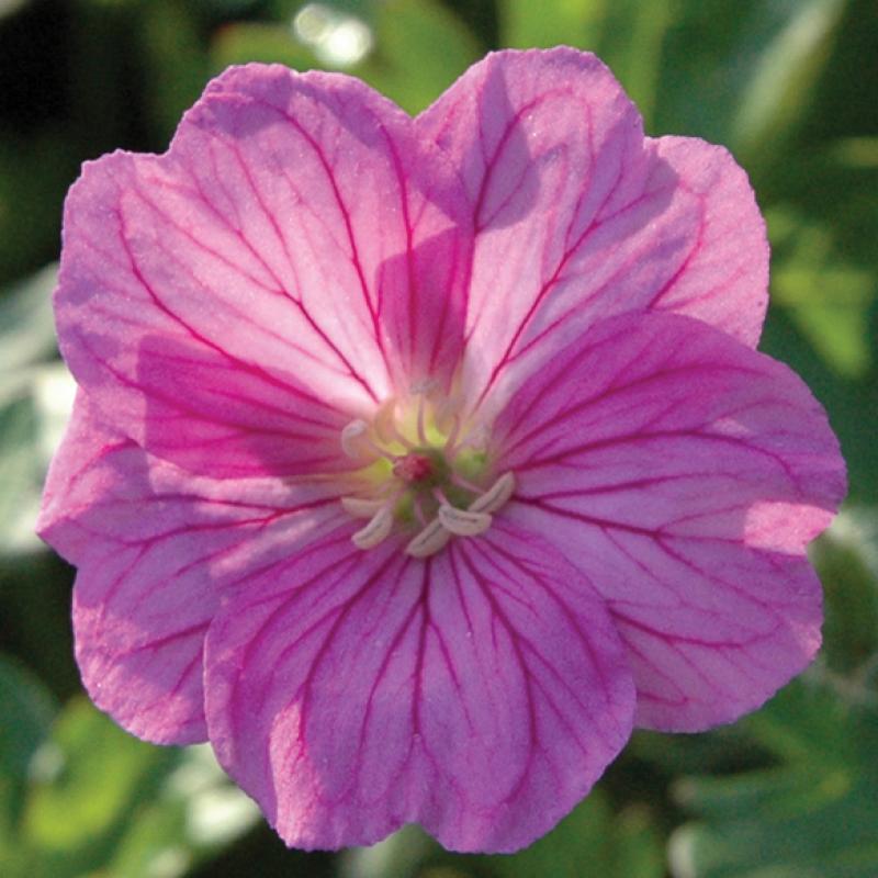 Vibrant rose-pink, 1.5" flowers with exquisite, reddish purple veins are produced all summer and into fall on this vigorous plant with finely divided, deep green foliage.