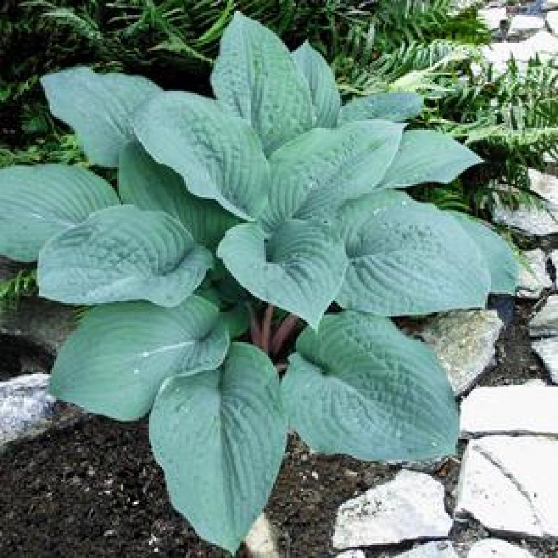 'Blueberry Muffin' produces large blue leaves with an interesting thickly puckered texture and light mauve speckled stems. It will form a medium-sized, compact mound that gives rise to lavender flowers that appear in July.
