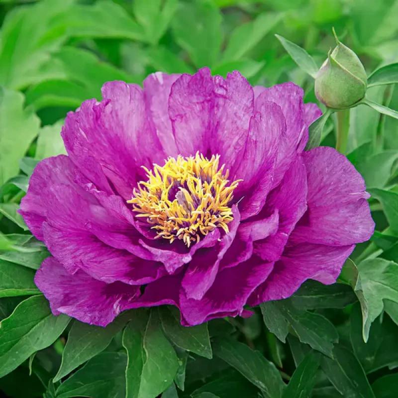 This stunning intersectional peony features deep lavender-purple petals and bright yellow centers. Long-lasting blooms, strong stems, and lush foliage make it a standout in sunny beds and borders.