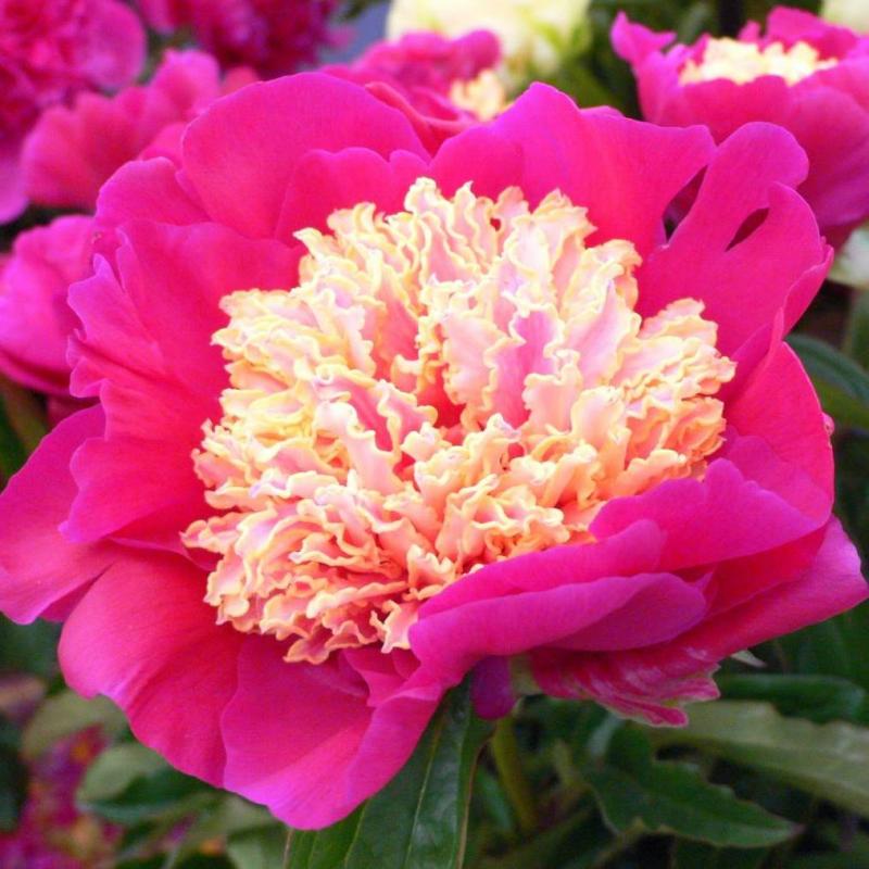 A vibrant Japanese-form peony with hot pink outer petals that surround a large, frilly, pale-yellow center. The intense color contrast makes this variety a standout in early-summer borders. Strong stems hold the flowers proudly, making it an excellent choice for cutting gardens and bold landscape displays.