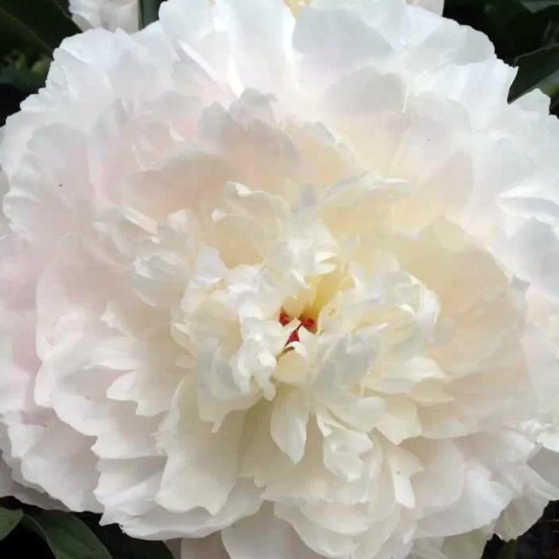 This fragrant midseason double white peony has very large flowers with a flat face. As it opens, the bloom is tinged with a delicate pink center that fades to off white.