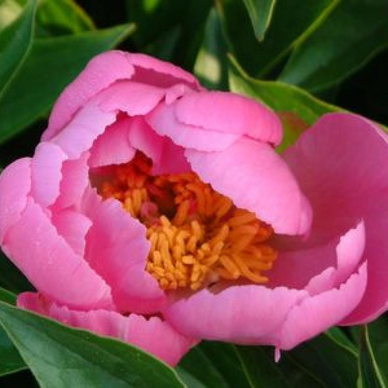 This single Japanese-style peony features bright lipstick-pink petals surrounding a small yellow center of stamens. It is an early to midseason bloomer.
