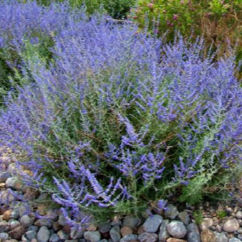 Compact and free-flowering, this Russian sage produces dense spikes of vivid violet-blue flowers from summer to fall. Aromatic silver-green foliage adds texture and resists deer and rabbits. A hardy, drought-tolerant perennial perfect for sunny borders, pollinator gardens, and mass plantings.