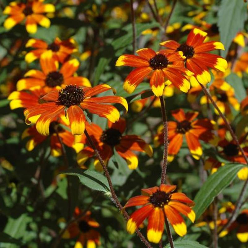 Tall, branching black-eyed Susan with masses of small, burnt-orange flowers tipped in golden yellow. Long summer bloom for prairie-style and pollinator gardens.