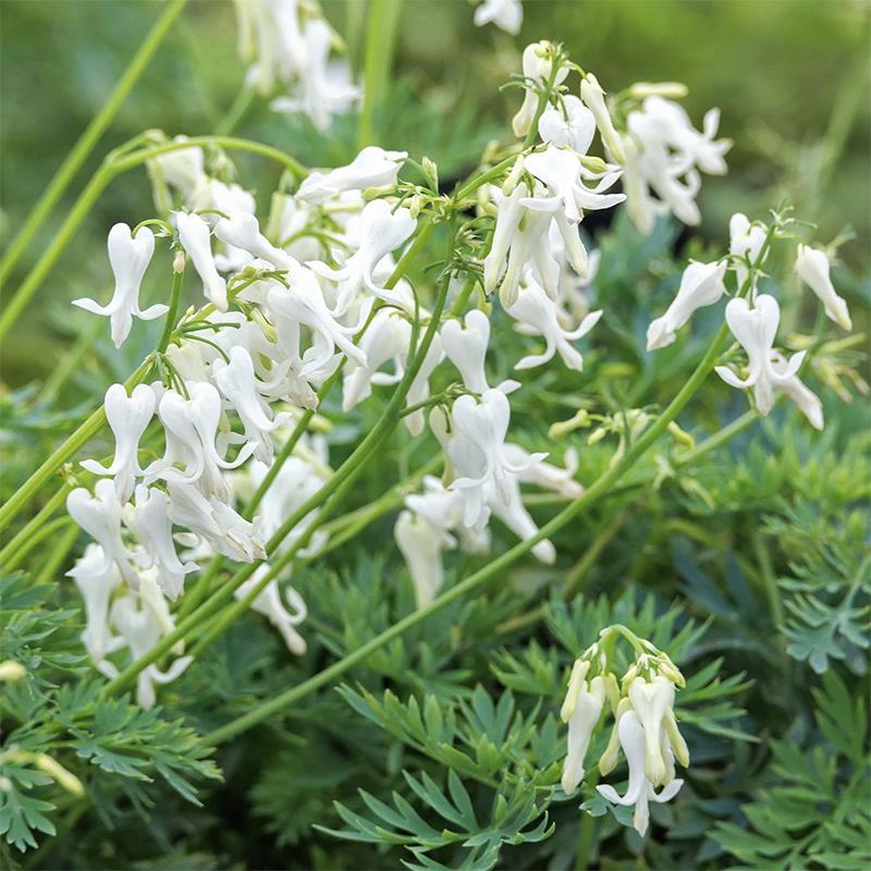 A compact, long-blooming bleeding heart with elegant white, heart-shaped flowers displayed above soft, fern-like foliage. Blooms from spring through summer and is more heat tolerant than traditional bleeding hearts.