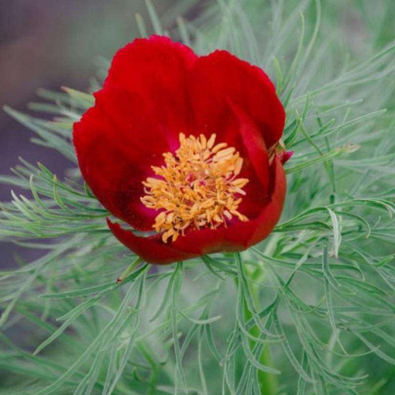 Brilliant scarlet-red single flowers appear in spring above finely divided, fern-like foliage that remains attractive all season. This unique heirloom peony offers bold color, delicate texture, and exceptional garden character.