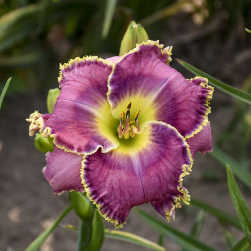 A showy daylily with rich raspberry-purple flowers, a glowing chartreuse throat, and a ruffled edge. A standout in summer borders with strong color contrast.