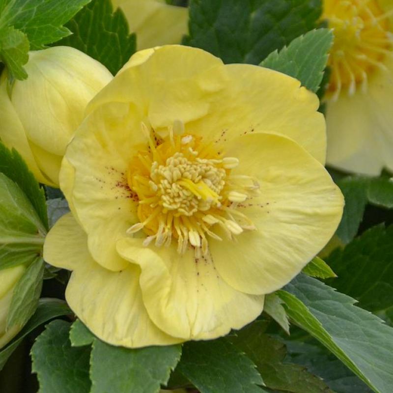 Evergreen perennial with large, semi-double buttery yellow flowers in late winter to early spring. Glossy, dark green foliage. Ideal for woodland gardens and shaded borders.