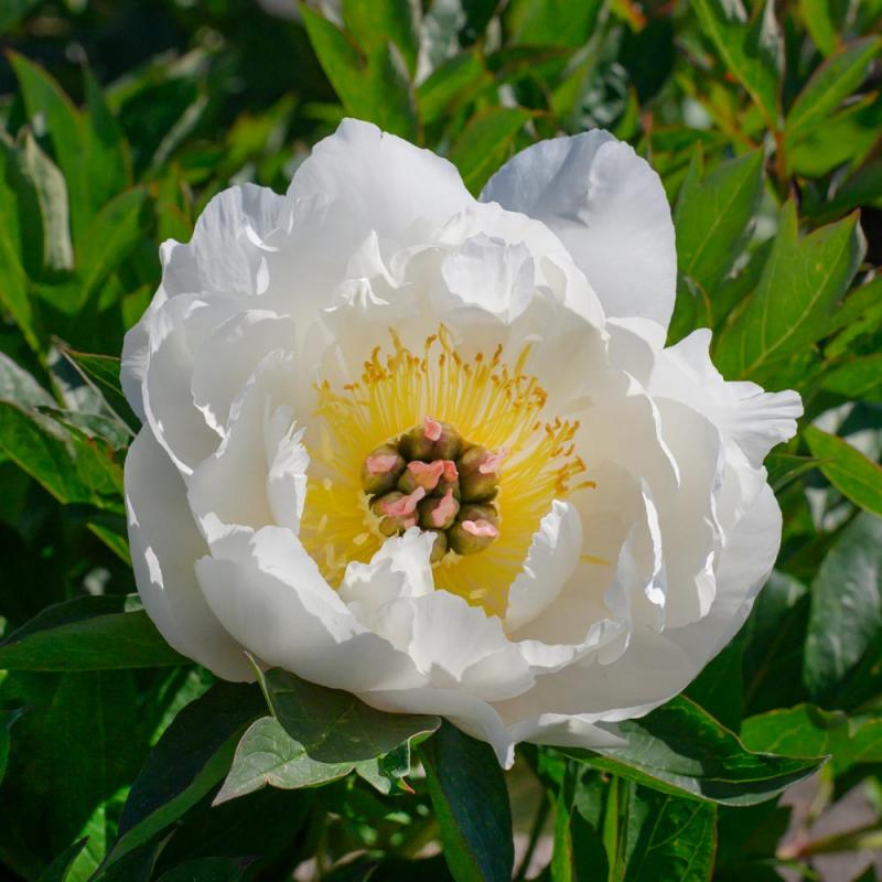 Elegant pure white blooms with glowing golden centers create a refined, romantic display in late spring. Strong stems, handsome foliage, and abundant flowers make this peony a standout in borders and cutting gardens.