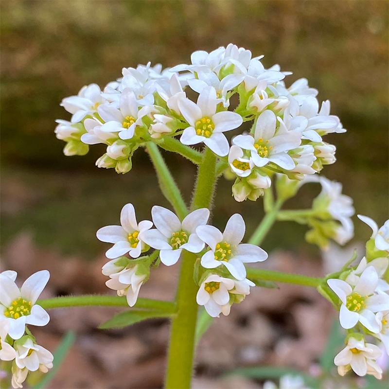A charming native woodland perennial with clusters of small white starry flowers held above tidy green foliage in spring. This early bloomer brings delicate beauty to shaded gardens, rock gardens, and naturalized woodland settings.