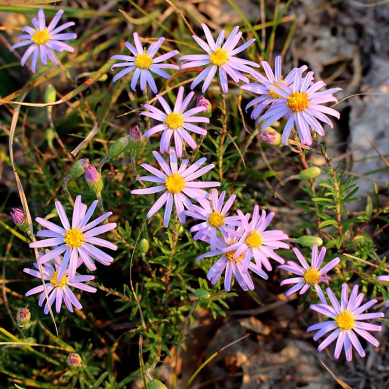A charming native aster with masses of lavender-blue daisy flowers and bright yellow centers in late summer to fall. Fine-textured foliage and a compact habit make it perfect for naturalized areas, borders, and pollinator gardens.