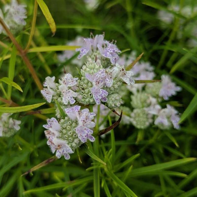 A hardy native perennial with fine, grassy foliage and clusters of tiny white to lavender-spotted flowers in midsummer. Highly aromatic leaves release a refreshing minty fragrance when crushed. An outstanding pollinator plant, it attracts a wide range of bees, butterflies, and beneficial insects, making it a valuable addition to naturalized and pollinator gardens.