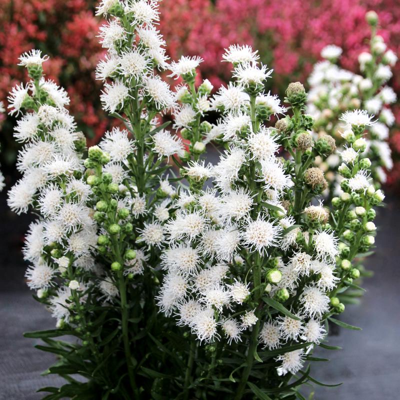 Elegant spikes of fluffy white flowers rise above grassy foliage in midsummer, creating strong vertical interest in sunny gardens. A magnet for butterflies and pollinators, this hardy native-style perennial is excellent for borders, meadow plantings, and cut flowers.