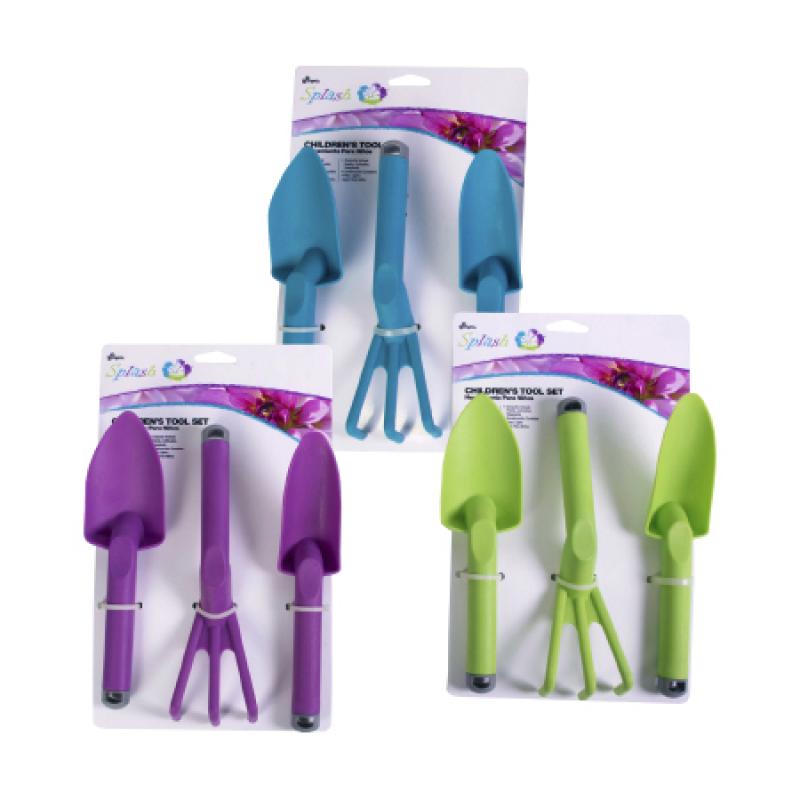 Three-piece set includes 8" transplanter, 8" cultivator, and 8" trowel. Each case includes all 3 Splash colors: blue, green, and purple.