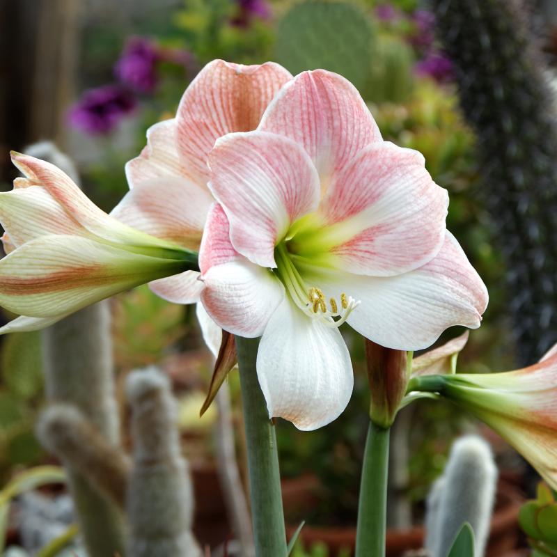 10" flowers in a variety of shades (many bi-colored), with bold, strap-like foliage that develops with or after flowering. A favorite for indoor potted plants.