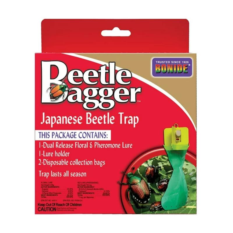 Beetle Bagger Japanese Beetle Trap is a dual floral and pheromone lure system that protects over 5,000 square feet all season long. The hourglass shaped disposable collection bag traps beetles securely. Bag perforations prevent rain water collection.
