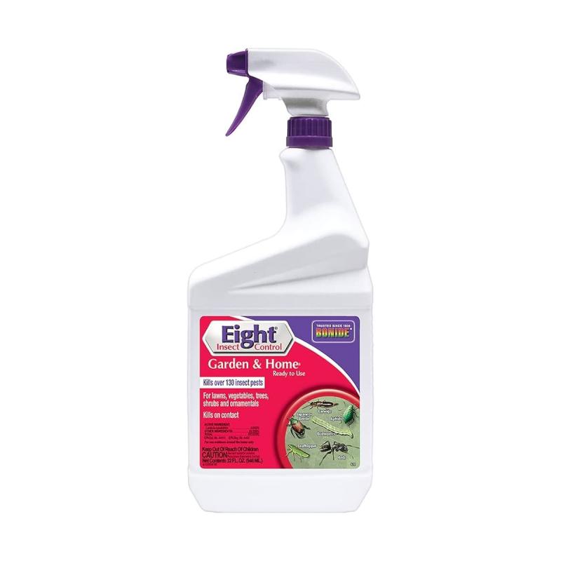 Eight Yard And Garden Insect Control controls over 100 different insect pests on vegetables, fruits, roses, flowers, lawns, shrubs, trees, over 60 varieties of ornamentals, and house plants. No odor, water based, indoor/outdoor.