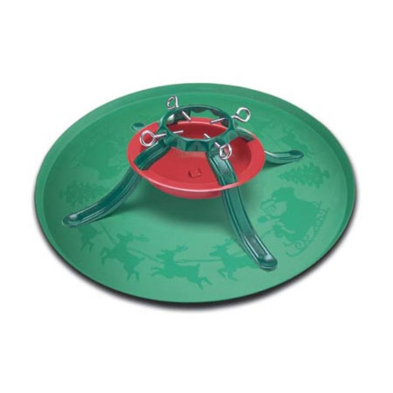 Green plastic tray for beneath tree stand to protect floors.
