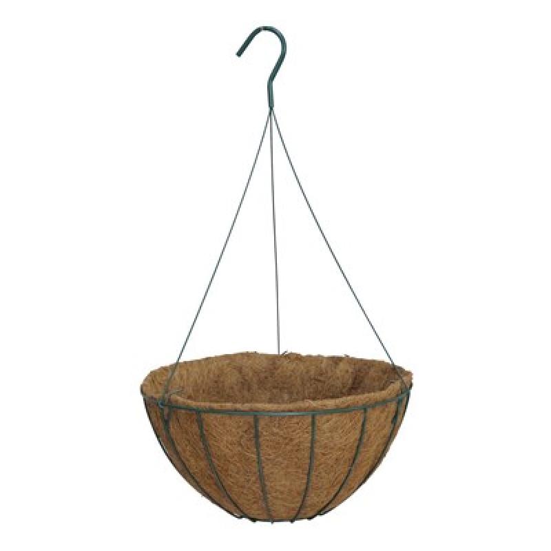 Rust-resistant , powder coated finish. For indoor or outdoor use. Features a sewn-in poly liner to retain soil moisture and includes a coco liner and wire hanger.