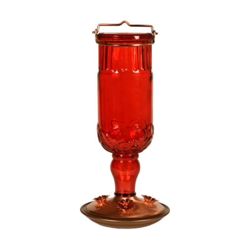 Bring a touch of elegance to your yard with the Red Antique Bottle Hummingbird Feeder. You will love the vintage accents and the hummingbirds will love feeding from the four decorative metal feeding ports.