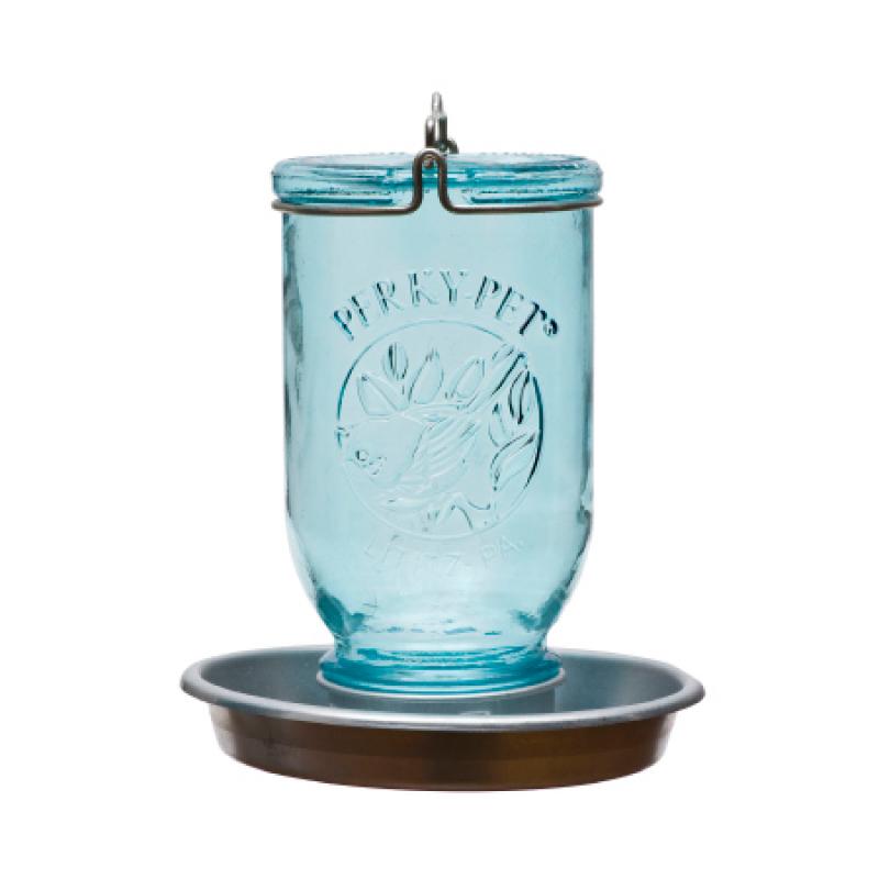 The blue antique glass mason jar shape of this feeder is attractive to both you and your backyard birds! With this birdwaterer, you can offer fresh, clean water to attract more birds to your yard. Holds 32 ounces of water.