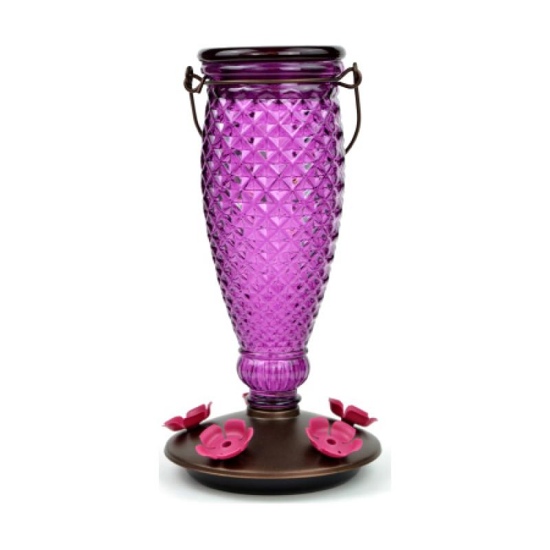 The Perky-Pet Diamond Wine Top-Fill Glass Hummingbird Feeder offers a unique Top-Fill wide-mouth bottle design to make filling and cleaning a breeze. Five hollyhock-inspired feeding ports are soft and flexible for a natural feel.