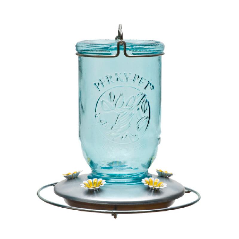 The blue antique glass mason jar shape of this feeder is attractive to both you and your backyard birds. The five feeding ports allow multiple hummingbirds to eat at one time. This feeder holds 32 ounces of nectar.