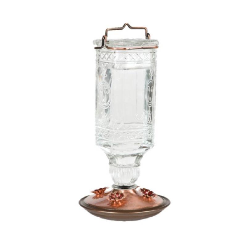 This beautiful clear antique glass bottle will add a touch of elegance to your backyard. The glass bottle holds up to 24ounces of nectar. Base has four ports and an antique copper finish.