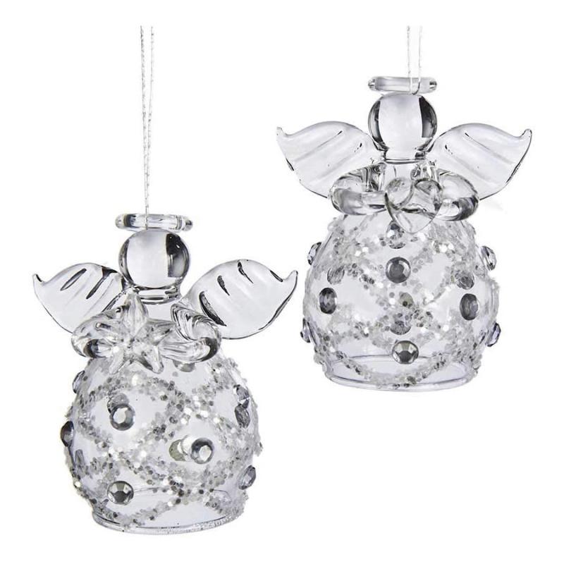 This clear glass angel ornament set from Kurt Adler is a beautiful addition to any holiday décor. Each angel in this set has a simple, clear design, including tiny halos and wings. The gowns of their dresses are beautifully adorned.