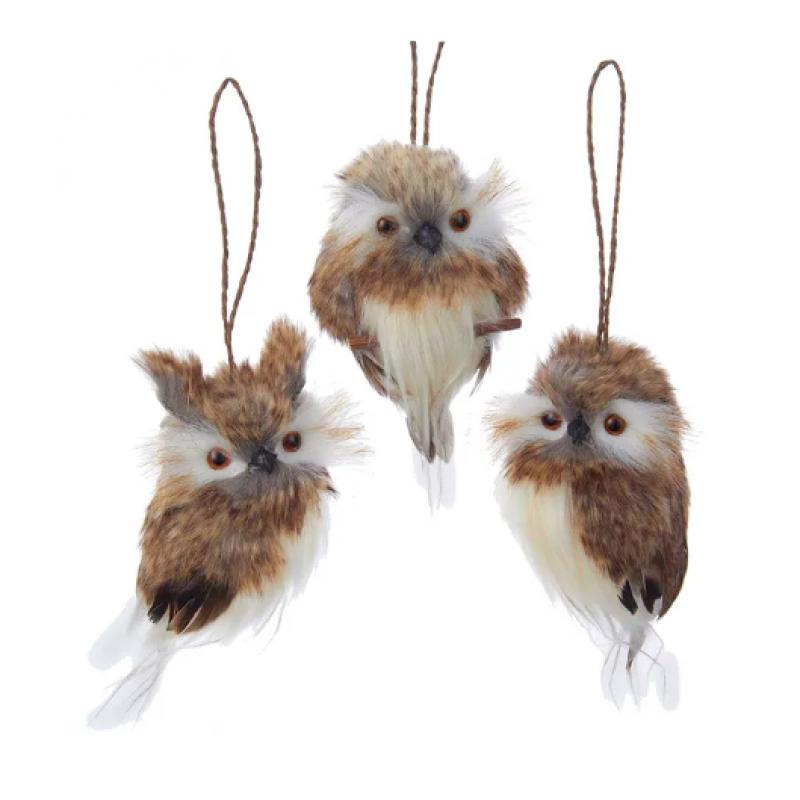 These Kurt Adler coffee and white hanging owl ornaments are a charming addition to any holiday décor or Christmas tree. This assortment features three owls, each owl with a beautiful coffee and white color scheme with coffee colored feather accents.