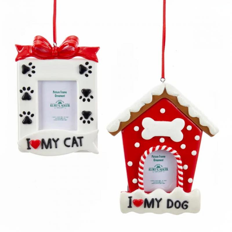Celebrate the holidays with your dog or cat! This red and white dog/cat picture frame is an adorable addition to any holiday décor! Includes a white frame with black paws and a red frame with polka dots and a dog bone.