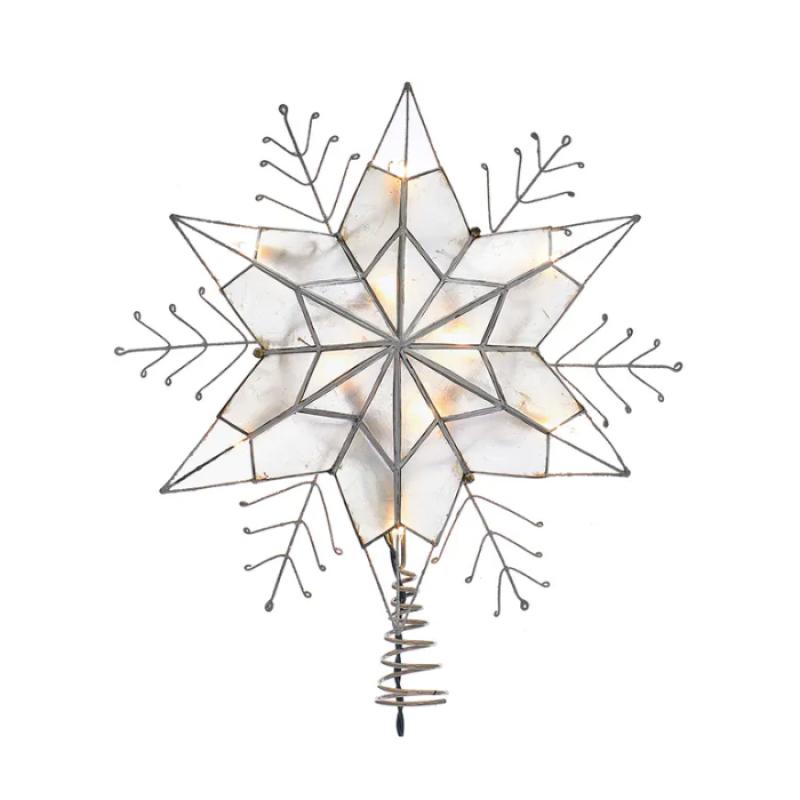 This Kurt Adler snowflake star tree top with clear lights is a beautiful, classic way to add to the lighting of your Christmas tree. The metal and plastic design features a capiz 6-point star that reveals a silver wire snowflake design.