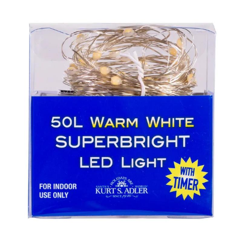 Kurt Adler's battery-operated warm white superbrite LED light set is a new addition to our extensive light line. Each light set has 50 warm white superbrite LED lights, a timer and silver wire for easy decorating.