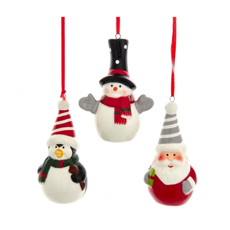 These Ceramic Penguin, Santa & Snowman Ornaments from Kurt Adler, available in an assortment three pieces, are charming and delightful holiday decorations that will add a touch of whimsy and cheer to your festive decor. These ornaments are crafted with care and attention to detail, making them a perfect addition to your holiday collection. Each ornament in this assortment features a different iconic holiday character: a penguin, Santa Claus, and a snowman. These classic figures are instantly recognizable and evoke a sense of nostalgia and warmth associated with the holiday season. Each ornament is adorned with colorful and festive motifs that capture the essence of the characters they represent. The penguin ornament is a playful representation of a charming penguin with its distinctive black and white markings, creating a delightful wintery atmosphere. The Santa Claus ornament showcases the jolly old man himself, complete with his iconic red suit, white beard, and a sack of presents, embodying the spirit of gift-giving and joy. The snowman ornament captures the whimsy of a classic snowman with its carrot nose, coal eyes, and a scarf, bringing a touch of winter wonder to your holiday decor. These ornaments are not only great for traditional holiday decorating but also make fantastic collectibles or thoughtful gifts for friends and loved ones, adding a personal and nostalgic touch to the festive season. Their timeless and hand-crafted design ensures they will be cherished for years to come.