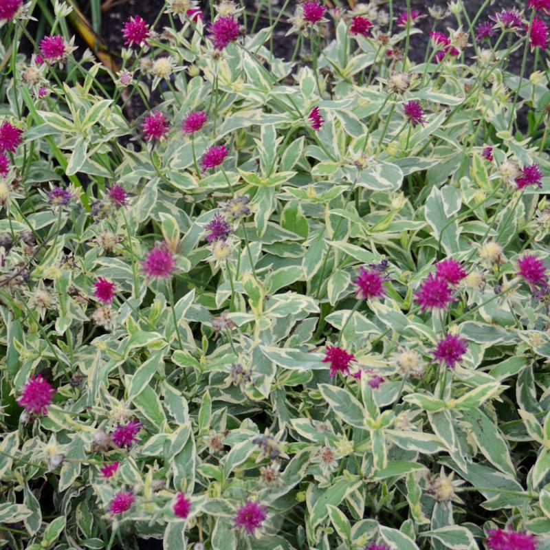 Wow! This variety's heavily serrated gray-green foliage is accented by creamy white, giving a striking backdrop to the deep purple-red flowers with a pincushion shape that bloom from late spring through early fall.