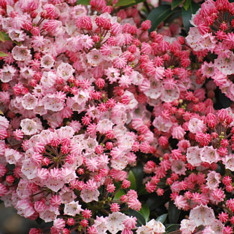 'Tiddlywinks' will produce clusters of rich pink buds that open to light pink flowers in early June. The dark evergreen leaves with red new growth form a compact shape making this plant perfect for small shaded areas.