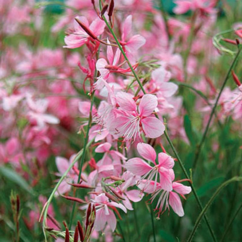 'Pink Fountain' features clear light pink flowers that emerge on wand-like panicles from June until September. These compact, yet airy plants also offer hints of red in the foliage.