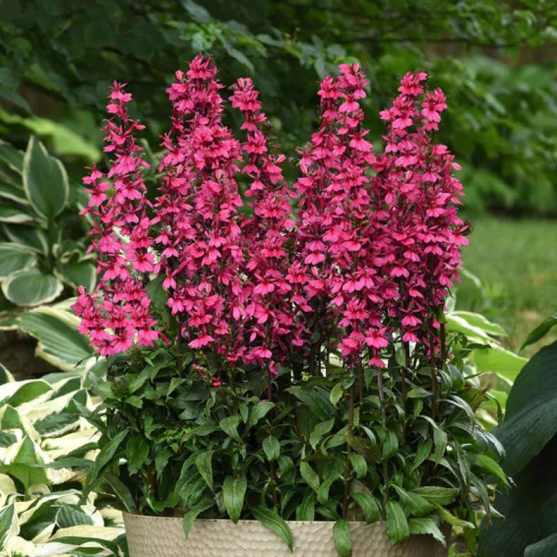 'Starship Rose' delivers bold vertical drama with vivid rose-pink flower spikes that bloom in midsummer. A pollinator favorite, this compact yet striking Lobelia performs best in moist soil and adds bright color to borders, rain gardens, and containers.