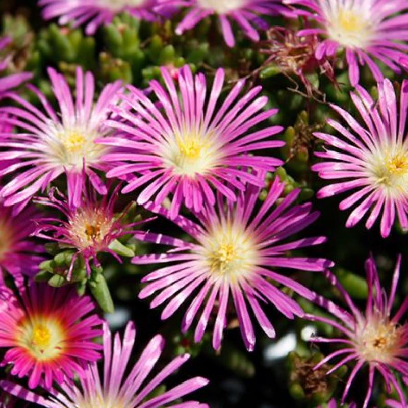 'Delmara Pink' features shimmering, daisy-like flowers in vivid pink with sunny yellow centers. This drought-tolerant groundcover blooms profusely from late spring through fall and thrives in hot, dry spots. Perfect for rock gardens, borders, and container edges.