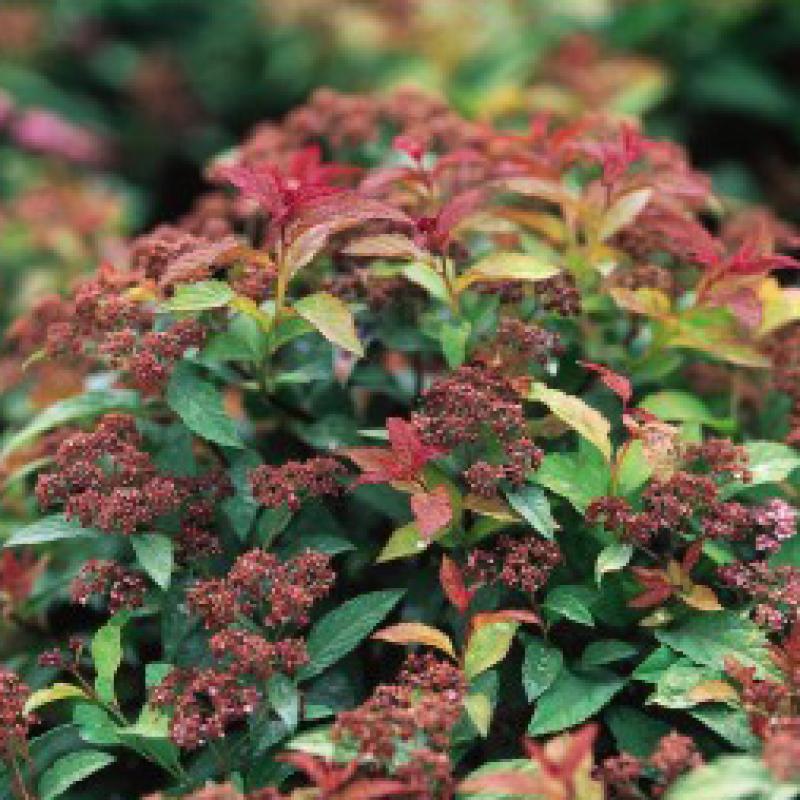 This trouble-free accent or foundation plant offers beautiful crimson-pink flowers in midsummer over brilliant new growth that starts red, then changes to yellow before settling in as yellow-green.