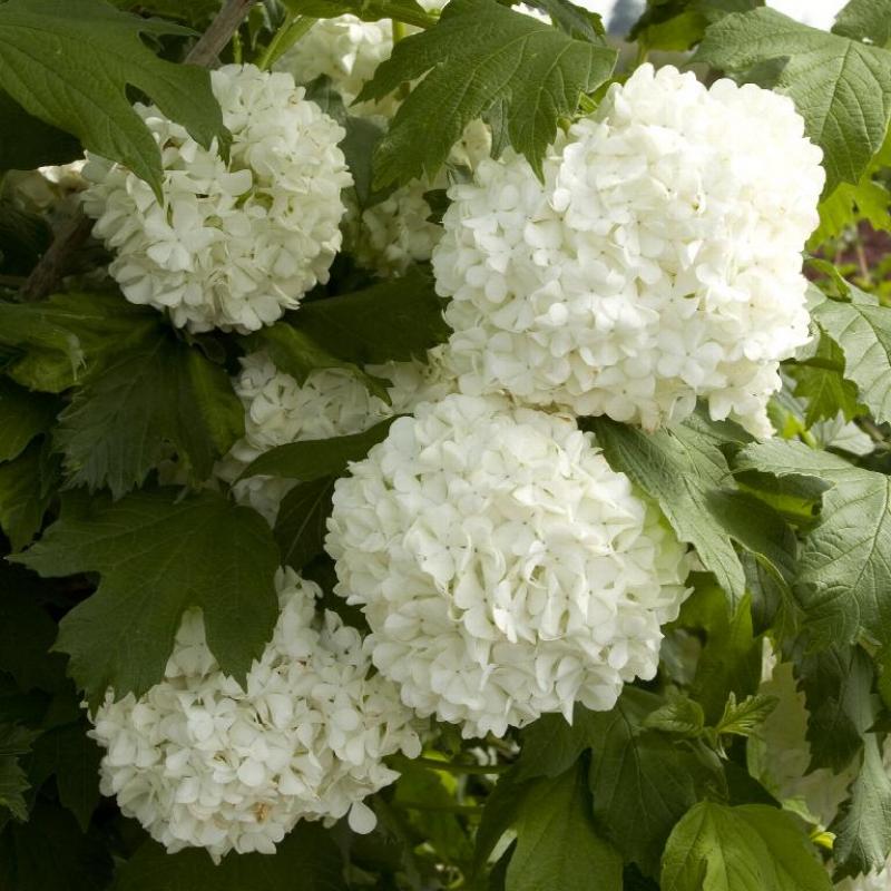 A showy, old-fashioned shrub prized for its large, rounded clusters of pure white, sterile flowers resembling snowballs. Blooms in late spring and offers bold texture in borders, screens, or as a garden focal point.