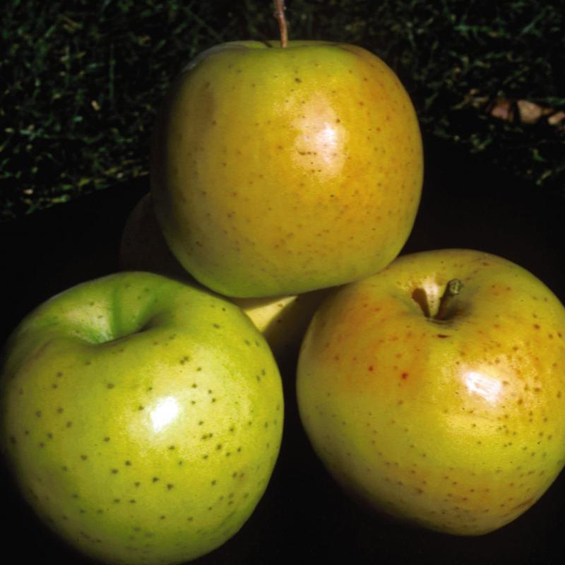 Produces medium to large sized fruit with a golden yellow- green color and a reddish blush. The fruit tastes similar to golden delicious, ripens in late September or October and stores well.
