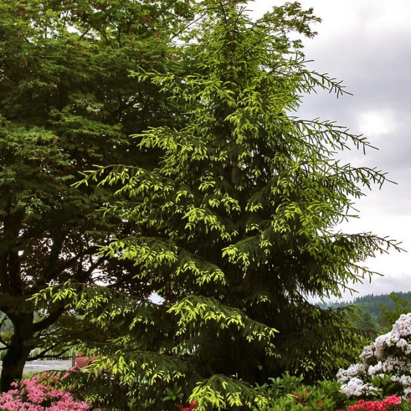 'Aureospicata' features short, dark green needles that are typical of Picea orientalis along with dramatic ivory-yellow spring growth which matures to dark-green by early summer.