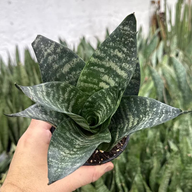 A compact Snake Plant variety with rosettes of thick, mottled green leaves arranged in a spiral form. ‘Sun Power’ is easy to grow and ideal for desks, shelves, or tabletops, thriving on minimal water and low light while filtering indoor air.