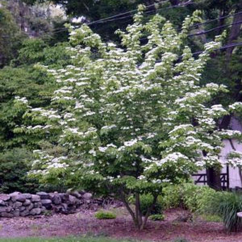 An abundance of creamy white, four-petaled, star-like flowers with green centers appear in late June hovering amid deep green, thick foliage. A burgundy-red fall color, exfoliating bark and interesting large red fruit add more appeal.