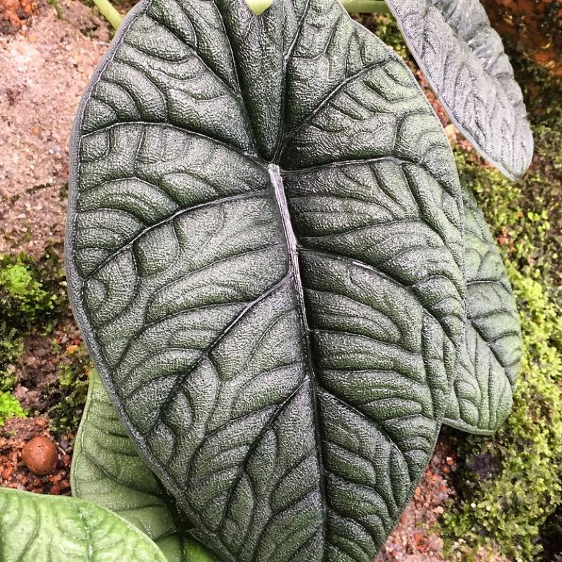 A rare, highly textured Alocasia with thick, leathery leaves in a unique gray-green hue. ‘Melo’ stands out for its deep, sculpted veins and almost stone-like appearance, adding exotic intrigue to any indoor tropical display.